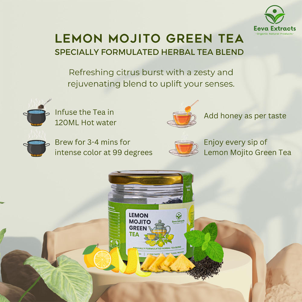 Lemon Mojito Herbal Tea by Eeva Extracts blends tangy lemon and refreshing mint, offering a rejuvenating and caffeine-free experience. Crafted from organic herbs, it supports digestion, detoxification, and hydration. Rich in antioxidants and free from additives, this handcrafted tea ensures premium quality and natural goodness.